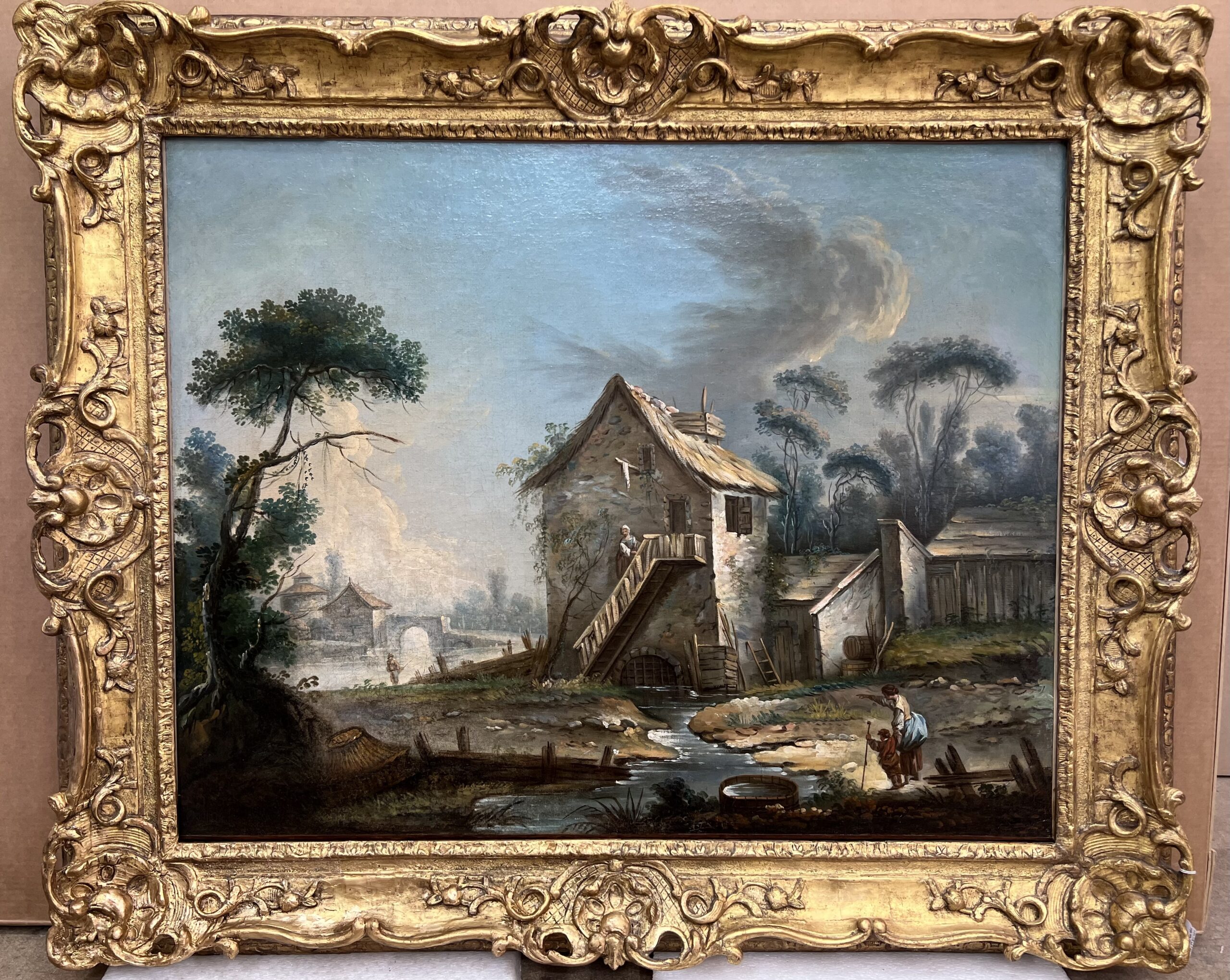A la suite d’une inondation deux peintures de paysages de François Boucher (1703-1770), d’une collection particulière, ont été traitées à l’atelier avec d’immenses précautions. L’importante infestation fongique du revers des toiles, entrainées par un taux d’humidité relative (HR) défavorable avant la découverte de ce sinistre sur les œuvres, avait déjà entrainé des conséquences sur les faces peintes. Il a fallu, en urgence, stopper les sporulations et les supprimer en évitant la dispersion alentour des spores, puis assurer un traitement antifongique adapté pour éviter le retour de ces biodétériorations (surveillance assurée à l’atelier), nettoyer et restaurer les couches picturales de ces deux œuvres, etc.